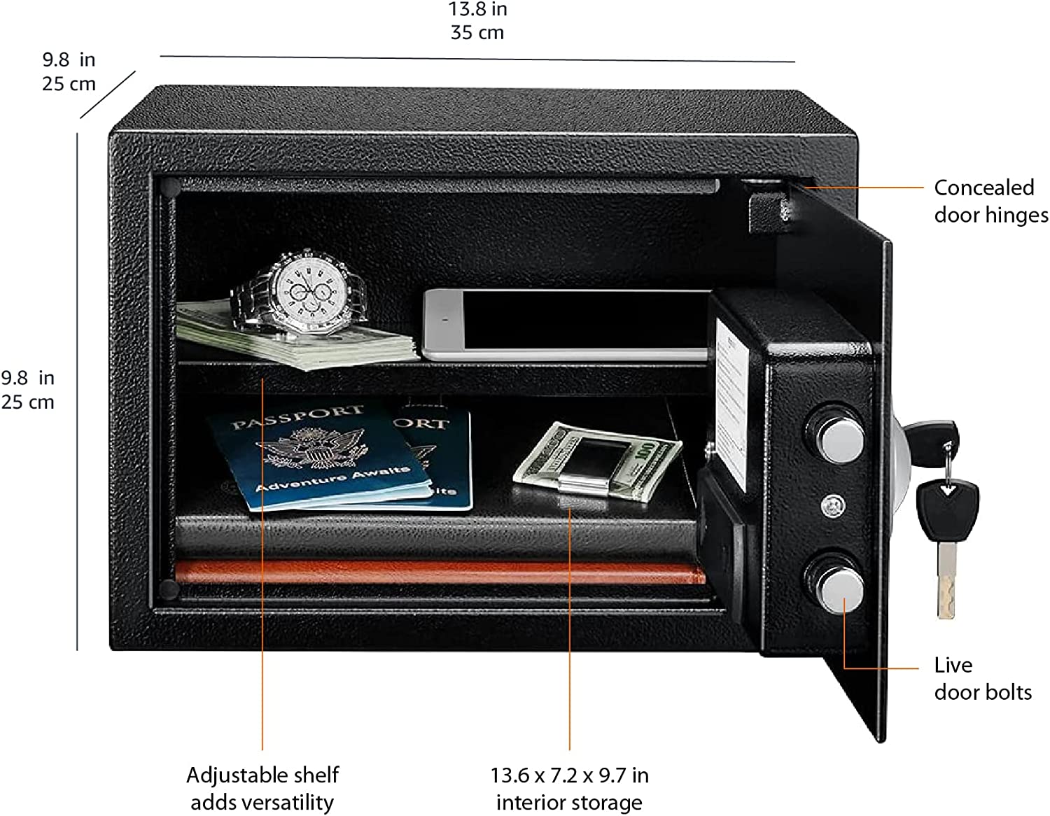- Exterior measures 13.8 x 9.8 x 9.8 inches (LxWxH); Interior measures 13.6 x 7.2 x 9.7 inches (LxWxH); door thickness is approximately 2 inches; product weight is 17.6 pounds