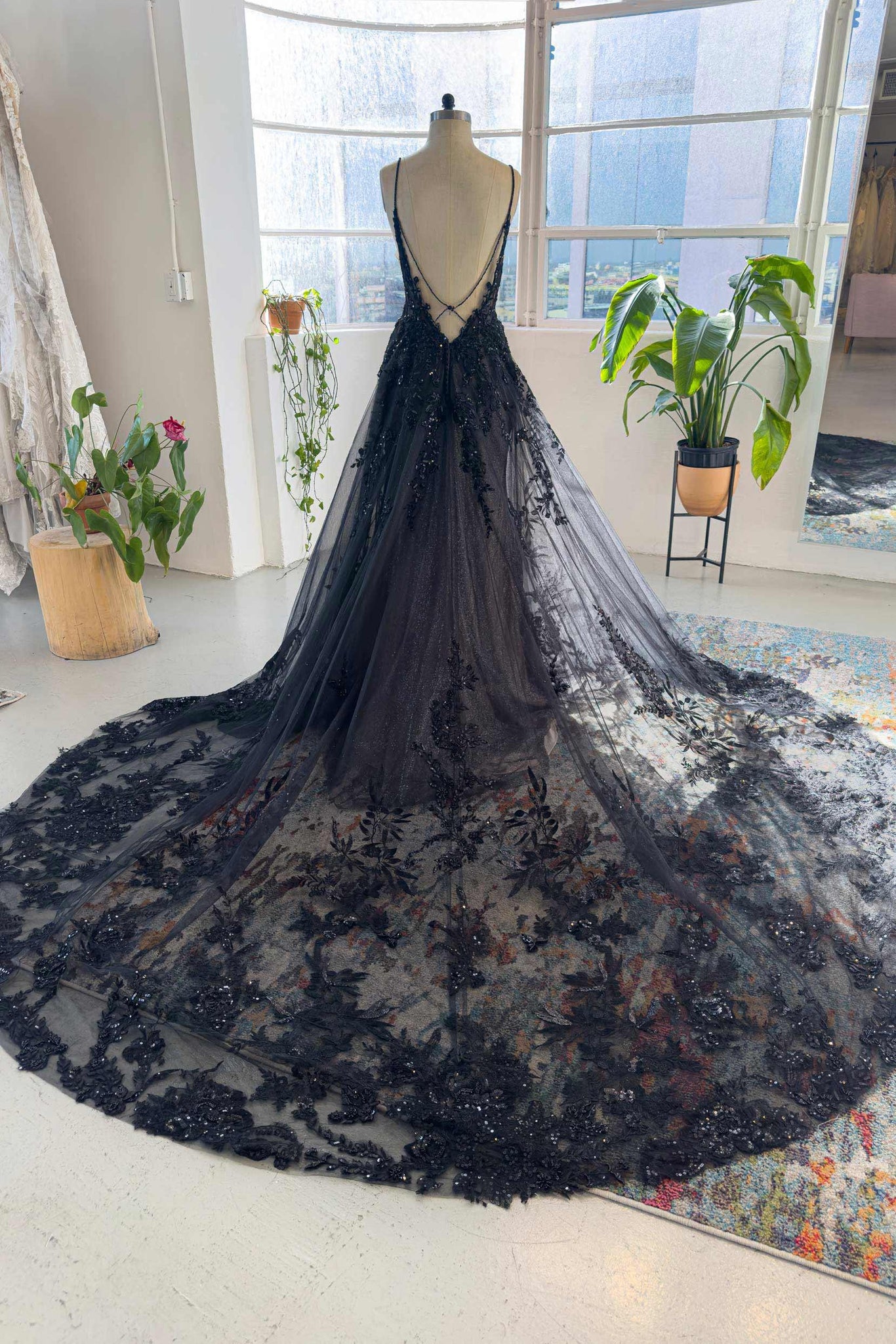 Boasting slender straps and a plunging V-neckline, it exudes a captivating allure. The Gothic-inspired design merges seamlessly with the delicate tulle A-line silhouette, adorned with exquisite Appliques and Beading that shimmer with sophistication, with breathtaking cathedral train, this gown is a timeless masterpiece.