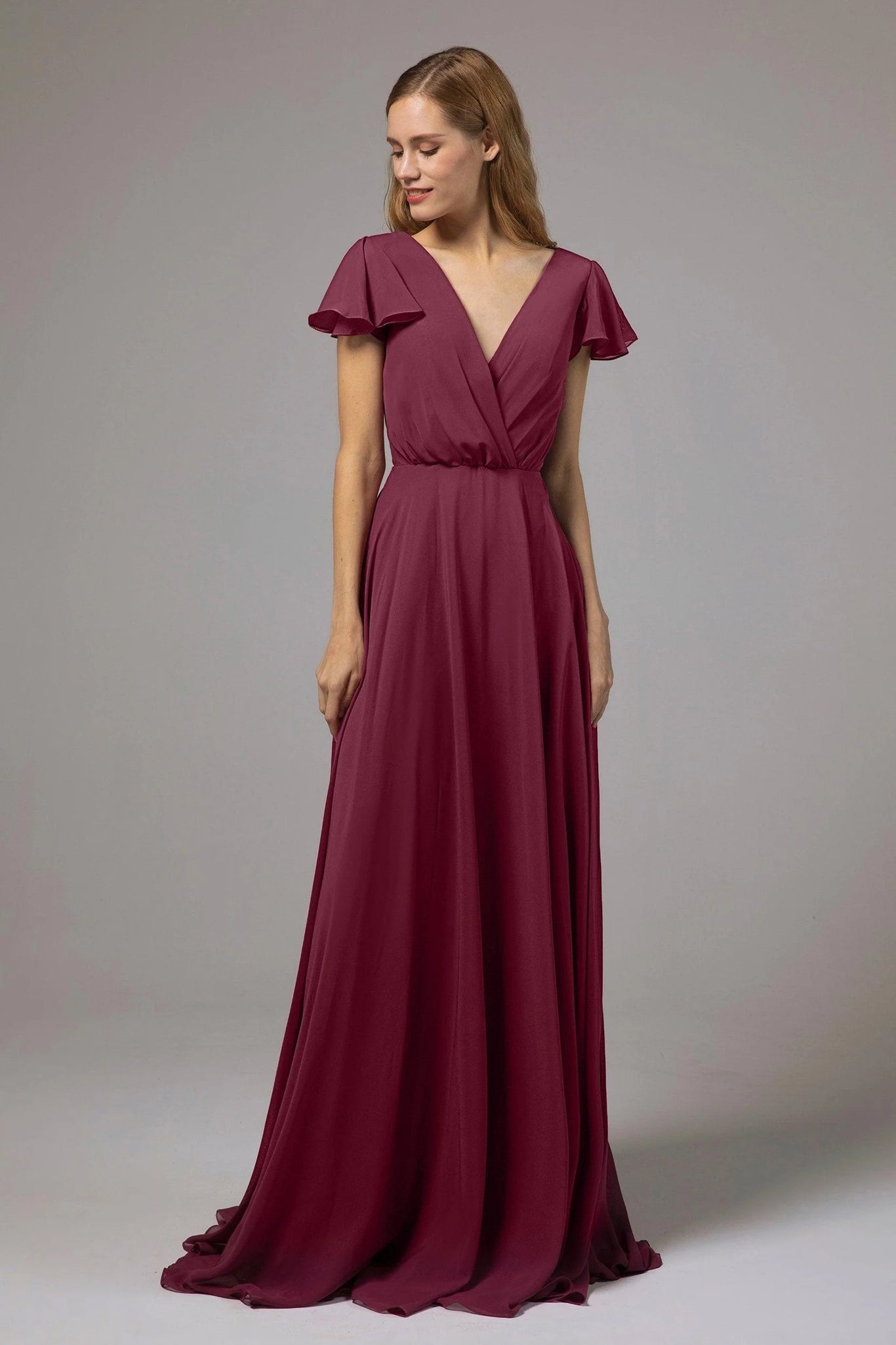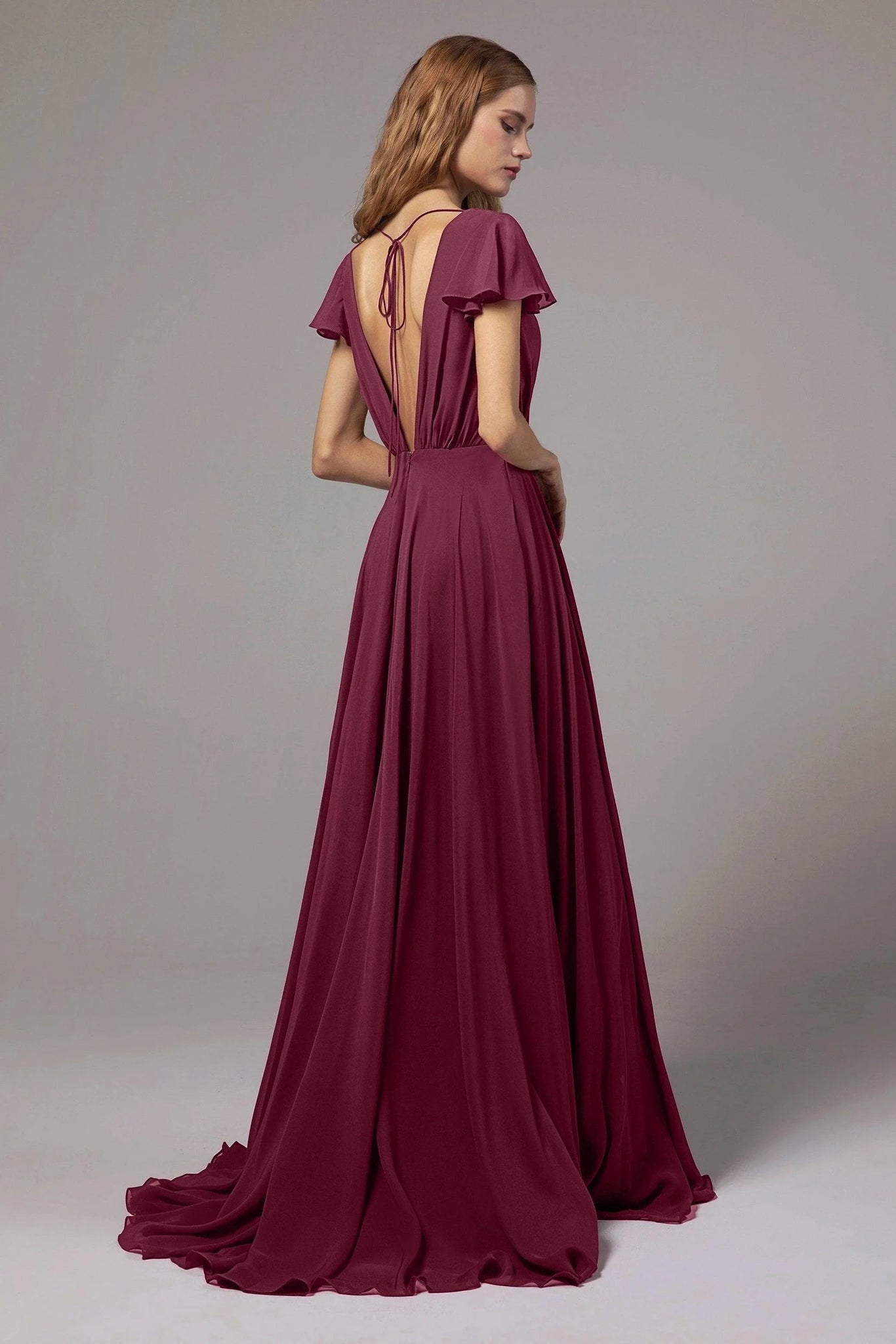 This chiffon bridesmaid dress combines elegance with practicality. A back zipper, flowy chiffon, and A-line skirt offer ease and grace. The V-neck and winged sleeves enhance allure, while the natural waist add unique details and convenience, perfect for any formal event.