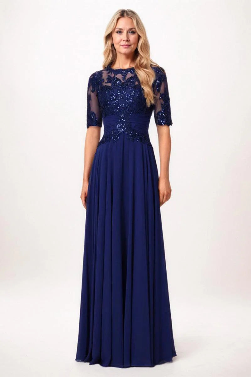 This A-line maxi dress exudes timeless elegance with its illusion neckline and half sleeves. Beautiful appliques add a delicate touch, while the natural waist and zipper back ensure a perfect fit. Crafted from luxurious chiffon, this dress is ideal for moms seeking sophistication at weddings, galas, or formal events.