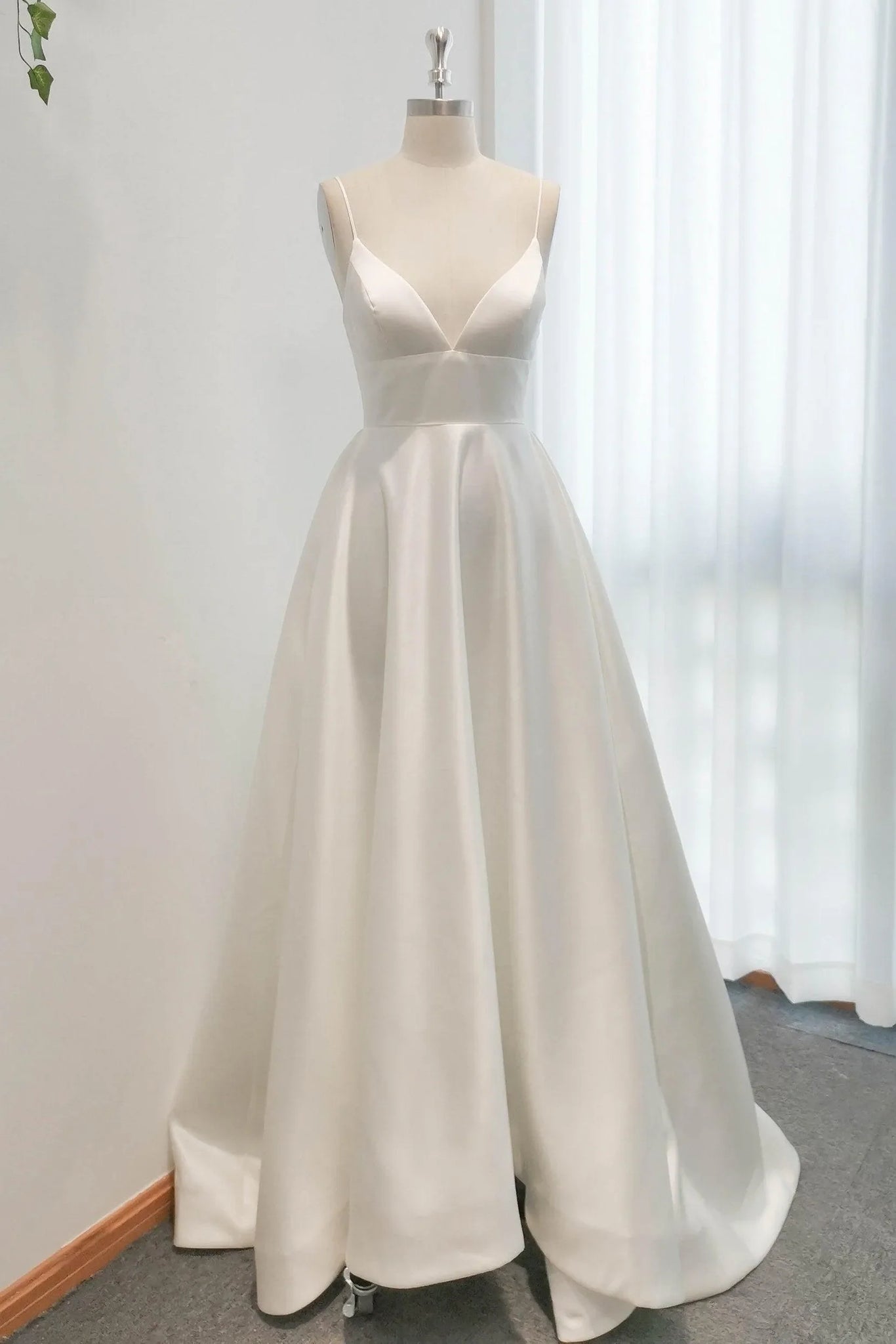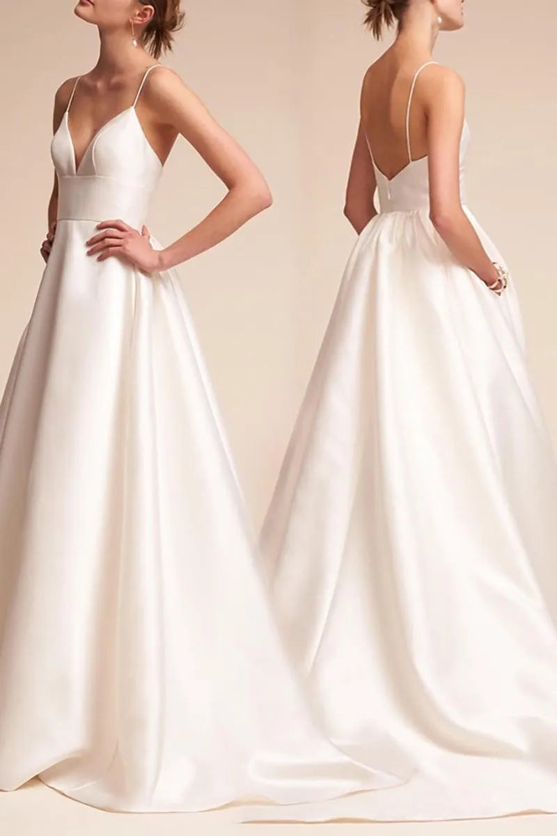 Unveil your elegance with the Ailani wedding dress! This stunning A-line gown features a flattering V-neck and a graceful sweep-brush train. Perfect for beach and garden weddings, customize your dream look today!