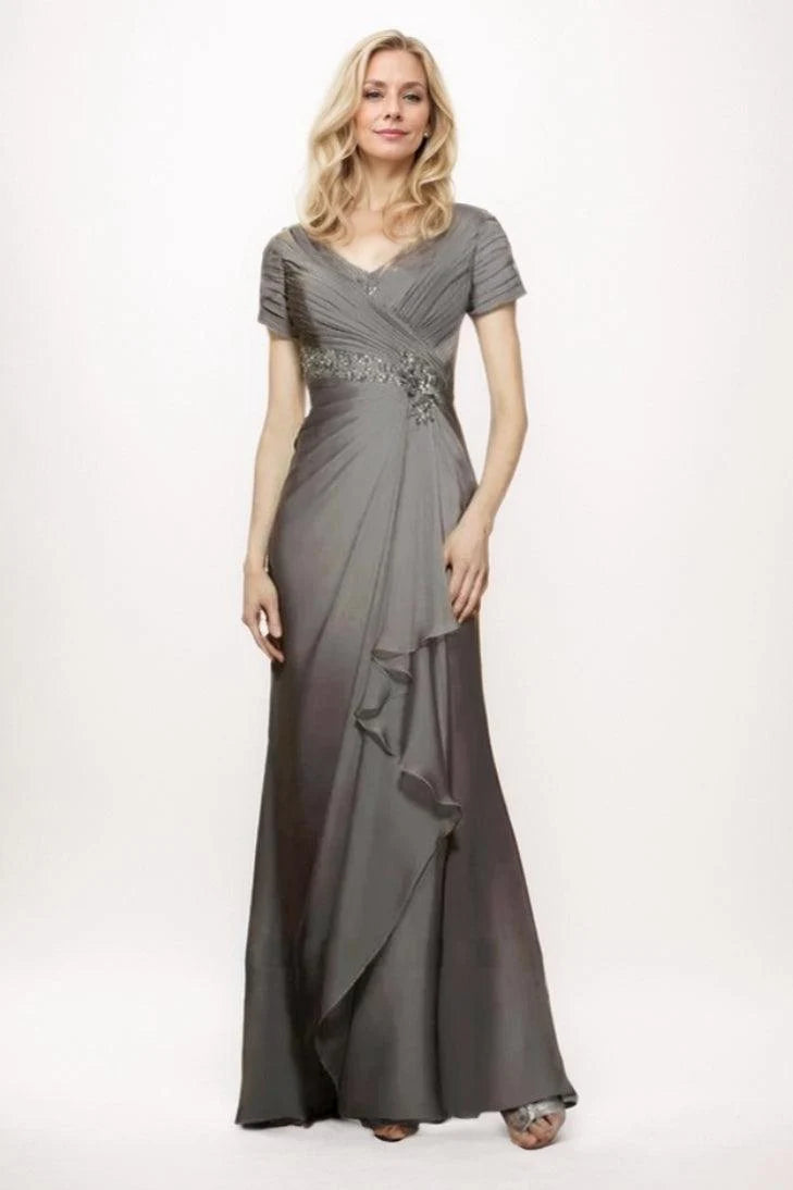 Step into elegance with chiffon sheath-column maxi dress, featuring V-neck, short sleeves, and ruffle details ideal for Mother of the Bride at any celebration.