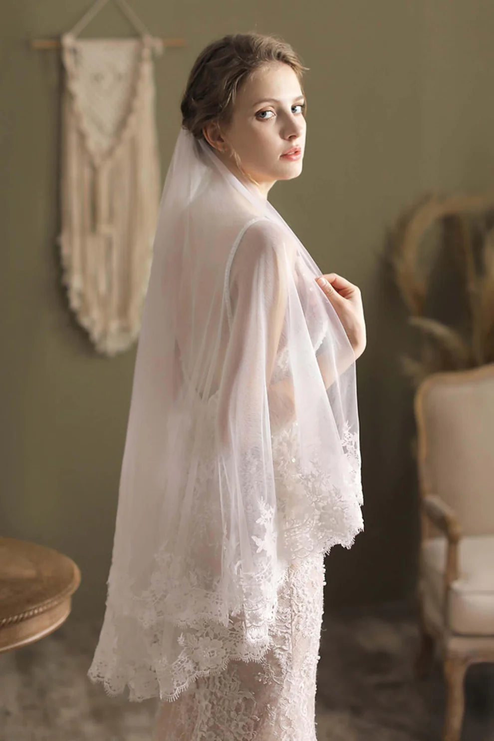 Two-tier Lace Edge Tulle , Lace Hip Veils with Appliques